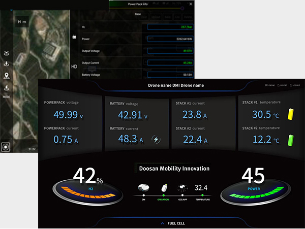 두산모빌리티이노베이션이 제공하는 DMI View App을 통해 실시간 잔여 수소량, 전압, 전류 등 파워팩의 성능 정보를 확인 할 수 있습니다. 또한 DMI 대시보드 홈페이지를 통하여 파워팩 및 드론 정보를 실시간으로 파악할 수 있습니다.